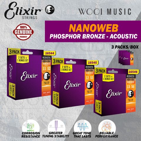 Elixir Nanoweb 80/20 Bronze 3/PACK Acoustic Guitar Strings [16564 Custom Light 11-52 , 16565 Light 12-53 ] New Packaging