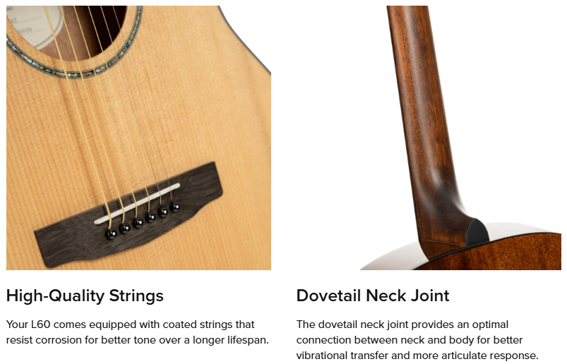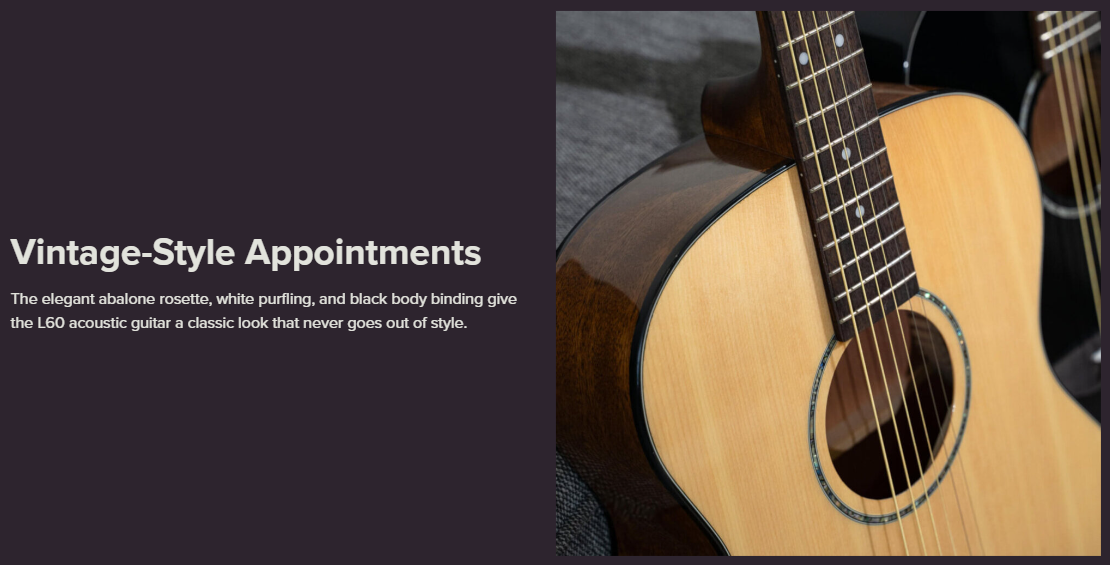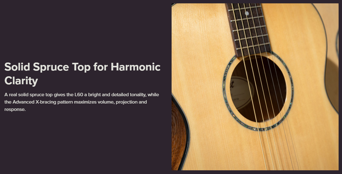 The smaller Orchestra body style gives the L60 acoustic guitar an articulate voice and easy playability that’s ideal for strummers and fingerpickers alike. With the enhanced projection and dynamics of a solid spruce top and Advanced X-bracing pattern, the L60 offers bold acoustic tone in a comfortably compact package.