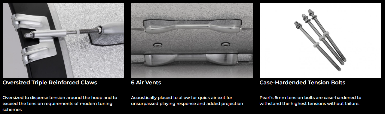 Pearl's shells are created via our Superior Shell Technology, utilizing a proprietary technique for achieving the ultimate air chamber. It begins with select woods chosen for their unique acoustic attributes, milled to precise thickness with overlapping scarf joint seams, for a perfect air-tight fit. The wood plies are saturated with Pearl’s proprietary “AcoustiGlue” that permeates every pore and dries to the exact consistency of the wood for optimum resonance. Finally, the plies are formed in high-temperature molds with 1000 PSI of hydraulic pressure to produce perfect drum shells that exhibit superior tone, optimal resonance and extreme strength.