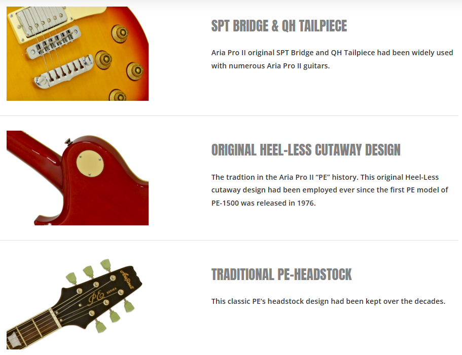 The Aria Pro II PE-350 has a superb playability, versatility and affordability. Keeping the vintage look but taking advantage of a thinner, lightweight body. Heel-less cutaway neck joint and contoured body back are also distinctive features of the PE series.