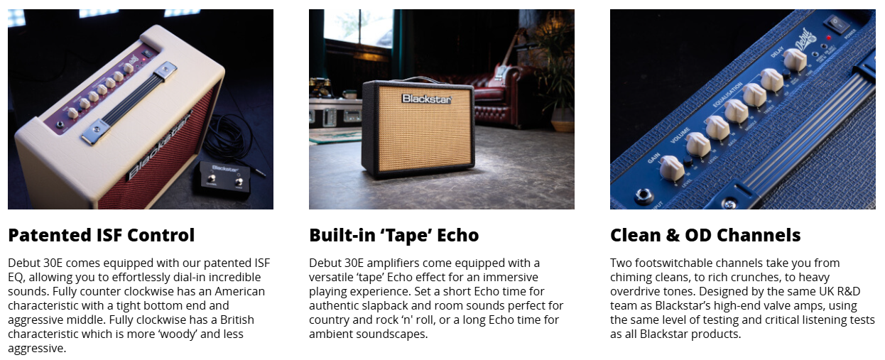 Every feature on the Debut 30E is designed to help you enjoy playing more — and keep discovering new sounds along the way. You get two footswitchable channels, our unique ISF (Infinite Shape Feature) tone control, a built-in tape-style Echo, and a headphone/line output for quiet playing. Simple to use, great to play — it’s everything you need to get stuck in and sound great from day one.