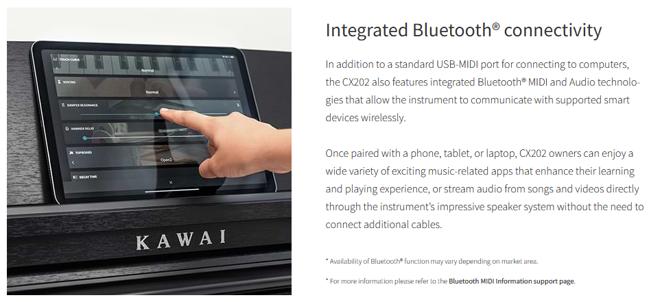 Featuring 88 grade-weighted keys, the CX202 keyboard responds like a real acoustic piano, while its rich concert grand tones encourage players to develop their musical skills. The instrument also includes Bluetooth MIDI and Audio connectivity, built-in lesson pieces, and a convenient song recorder, making the CX202 an ideal choice for beginners taking their first steps, or more experienced players considering a second piano for silent practice with headphones.